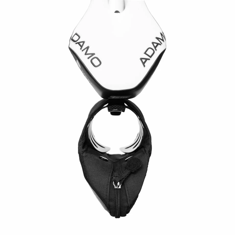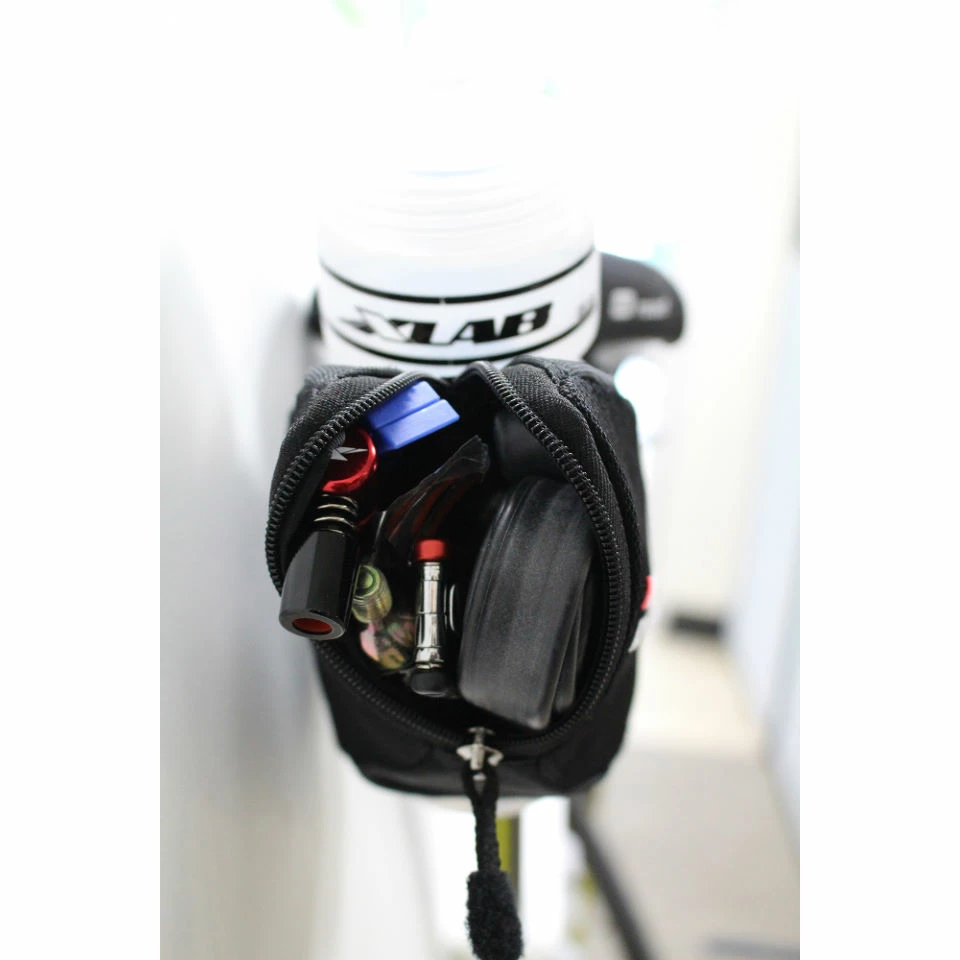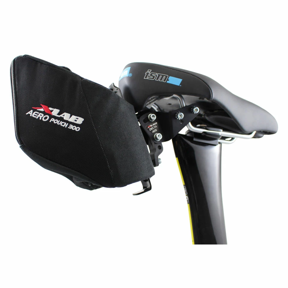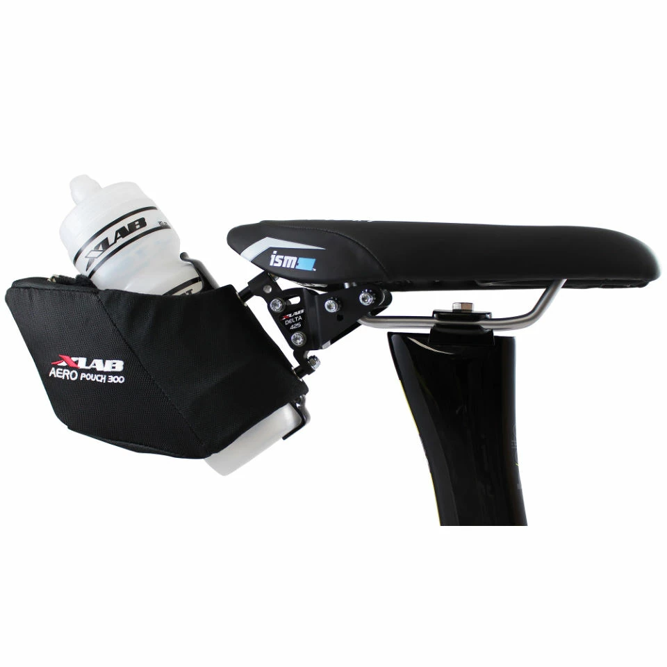 La sacoche de selle Aero Pouch 300 de XLAB a été conçue pour parfaitement interagir avec tout porte-bidon arrière unique en métal de XLAB.